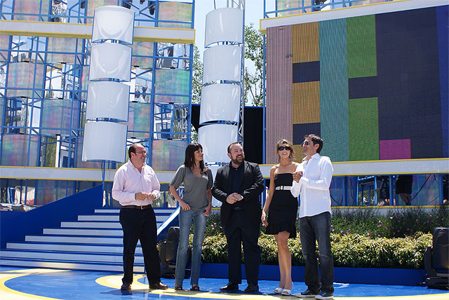 El alcalde de Puerto Lumbreras, el consejero de Presidencia y los presentadores de "Murcia Donde Vive el Sol" ultiman los detalles del montaje de la Gala