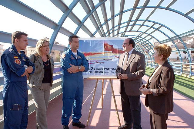 El alcalde de Puerto Lumbreras, Pedro Antonio Sánchez, acompañado del Comandante-líder de la Patrulla Águila del Ejército del Aire Español, Miguel Diez, el Teniente de Relaciones Públicas, Luis Verjano, la concejal de Interior del Ayuntamiento de Puerto Lumbreras, Dolores Arenas, y la edil de Festejos, Isabel García, han presentado esta mañana la participación de la patrulla del Ejército del Aire, en las Fiestas Patronales de Puerto Lumbreras 2008.