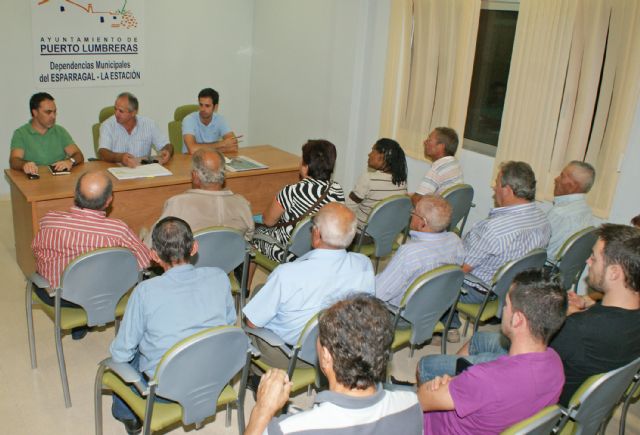 Martes 4 de octubre de 2011. El Ayuntamiento de Puerto Lumbreras ha convocado una reunión con los cerca de 100 vecinos de La Estación- Esparragal que podrían verse afectados por los procesos de expropiación de terrenos que requieren las obras del 'Proyecto Básico de Plataforma del Corredor Mediterráneo de Alta Velocidad' que impulsa el Gobierno Central a través del ministerio de Fomento. En dicho encuentro, el concejal de Desarrollo Rural, José María Parra, junto a técnicos municipales, informó sobre las actuaciones previstas en el proyecto de ADIF (Administrador de Infraestructuras Ferroviarias), así como sobre los plazos y posibles alegaciones que pueden presentar los ciudadanos propietarios afectados por las actuaciones.