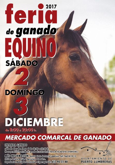 El municipio de Puerto Lumbreras acogerá una Feria de Ganado Equino los próximos días 2 y 3 de diciembre en el recinto del Mercado Comarcal de Ganado. El evento ecuestre se desarrollará en horario de mañana y tarde, de forma ininterrumpida, desde las 08.00 hasta las 20.00 horas