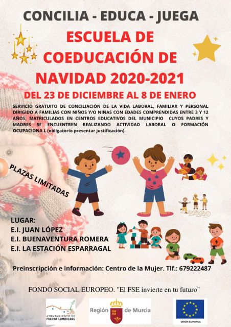 El Ayuntamiento de Puerto Lumbreras sigue implementando medidas para ayudar a las familias lumbrerenses. La concejal de Conciliación e Igualdad del Ayuntamiento de Puerto Lumbreras; Toñi Navarro, ha anunciado la celebración de la primera edición de la Escuela de Coeducación de Navidad en la localidad. Se llevará a cabo del 23 de diciembre al 8 de enero en las Escuelas Infantiles municipales Juan López, Buenaventura Romera y La Estación-Esparragal, en horario de lunes a viernes de 08:00 a 15:00 h. Un servicio gratuito destinado a familias con necesidades de conciliar en el periodo vacacional y cuyos hijos tengan edades comprendidas entre 3 y 12 años, empadronados en el municipio y matriculados en centros educativos de Puerto Lumbreras. Además, los padres deben justificar encontrarse en situación laboral (trabajando) o recibiendo formación para el empleo.