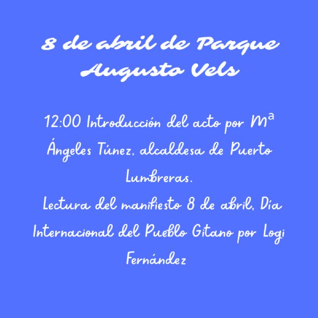 "Ya el día de la efeméride, el 8 de abril, a las 12:00 horas en el Parque Augusto Vels de la localidad se procederá a la lectura del manifiesto. Un acto que contará con la presencia de María Ángeles Túnez, alcaldesa de Puerto Lumbreras, que pronunciará un discurso previo a la declaración oficial. La lectura del manifiesto correrá a cargo también de Logi Fernández", ha añadido José Manuel Sánchez.
