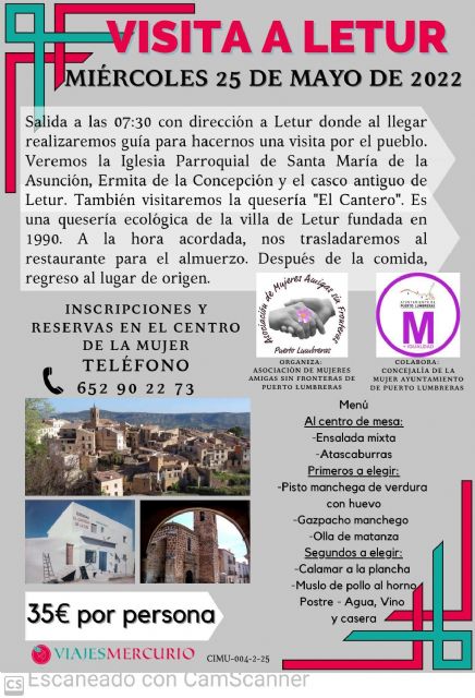 La hora de salida de este segundo viaje será a las 07:30 horas desde Puerto Lumbreras. "Se ha pensado una jornada completa de gastronomía y turismo en este punto de Castilla La Mancha. El objetivo es distintos lugares de interés y monumentos históricos de este pueblo. Entre ellos, la Iglesia Parroquial de Santa María de la Asunción, Ermita de la Concepción, casco antiguo de Letur", ha indicado la edil.