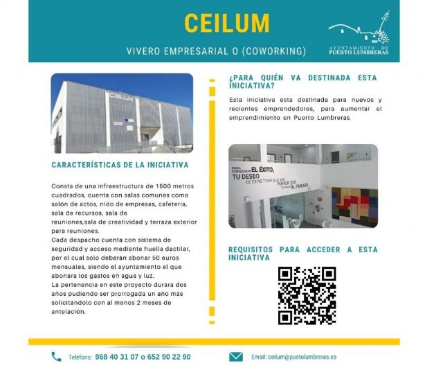 La concejala de Dinamización Económica del Ayuntamiento de Puerto Lumbreras, Rocío Martínez, ha informado sobre la apertura del plazo para solicitar plazas en el Vivero de Empresas Culturales y Creativas 'Ceilum'.