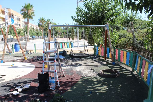 En concreto, la alcaldesa ha indicado que "se están procediendo al desmontaje, restauración y limpieza de los juegos, para su posterior colocación. Hablamos de lijado, pintado y reposición o sustitución de los diferentes elementos que conforman la instalación infantil. Este mismo proceso se lleva a cabo también en el suelo de la instalación. Además, se colocará la señalización de zona de juegos".