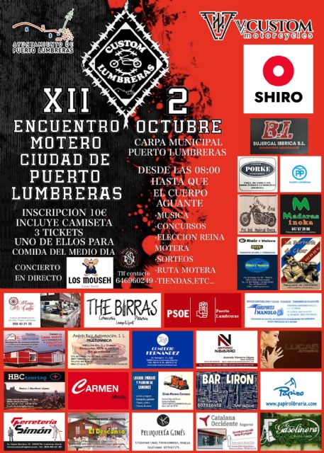 "Animamos a todos los interesados en el mundo motero y a vecinos y ciudadanos lumbrerenses a apuntarse y participar en el XII Encuentro Motero Ciudad de Puerto Lumbreras para pasar todo un día completo motero. Agradecer a la Peña Motera Custom Lumbreras por llevar a cabo este nuevo encuentro que permite potenciar la actividad social, económica y deportiva en el municipio", ha concluido el concejal.