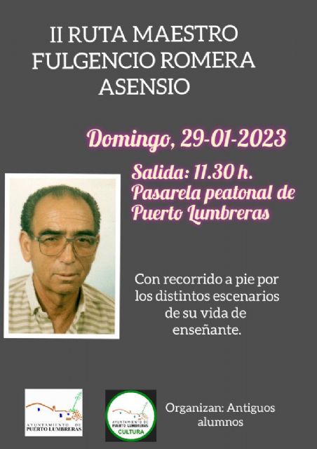 "Este domingo, 29 de enero, se realizará la II Ruta Maestro Fulgencio Romera Asensio (1923-2021) por las calles de la localidad. Se trata de un recorrido, organizado por antiguos alumnos del docente (que ya le hicieron un primer reconocimiento con el libro 'El Maestro', compuesto por cerca de 60 relatos que plasma su paso por la escuela-Academia), en el segundo aniversario de su fallecimiento, para rememorar su trayectoria profesional entre los años 1947 y 1988, y su influencia en la juventud de Puerto Lumbreras y sus alrededores a lo largo de cuatro décadas", ha explicado el edil.