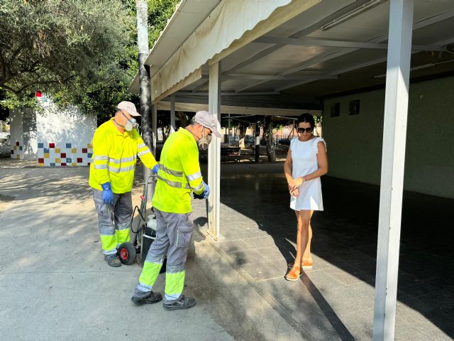 La concejal de Sanidad del Ayuntamiento de Puerto Lumbreras, Cristina Herrero, ha supervisado las labores de fumigación y control de plagas que se están realizando, esta mañana, en los parques y jardines del municipio.