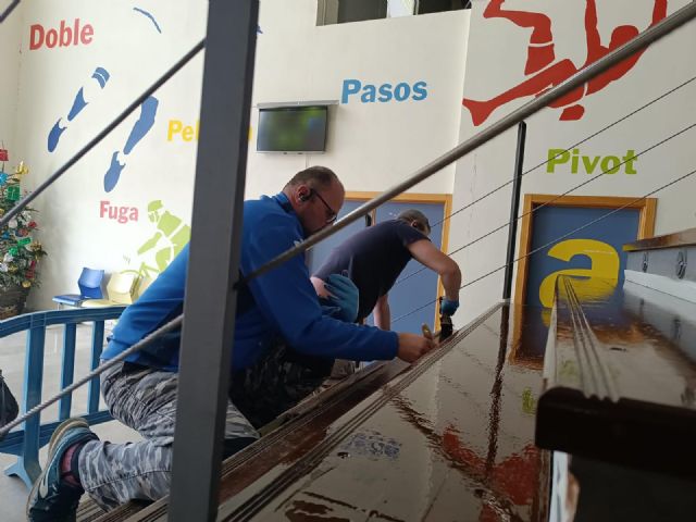 "Entre los trabajos realizados destaca el repintado de todo el graderío del complejo deportivo, así como de la recepción, del pasillo de entrada a los vestuarios y las escaleras de acceso al gimnasio".