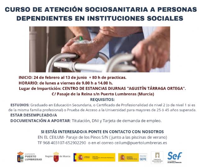 Pérez ha anunciado que "desde el Ayuntamiento de Puerto Lumbreras, a través de la Concejalía de Empleo y Servicios Sociales, se va a poner en marcha el Curso de Atención Sociosanitaria a Personas Dependientes en Instituciones Sociales con 80 horas de prácticas".