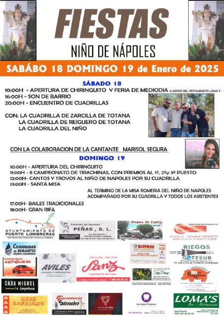 "Este próximo fin de semana celebraremos las fiestas en honor al Niño de Nápoles. Una festividad que, cada año, se realiza en la Ermita ubicada en la zona de 'El Descanso' de Puerto Lumbreras. En concreto, serán los días sábado 18 y domingo 19 de enero. El sábado, el programa comenzará a las 10:00 horas con la apertura del chiringuito y Feria de Mediodía, a cargo del Restaurante Loma's, y a las 16:00 horas tendrá lugar la actuación del grupo Son de Barrio".