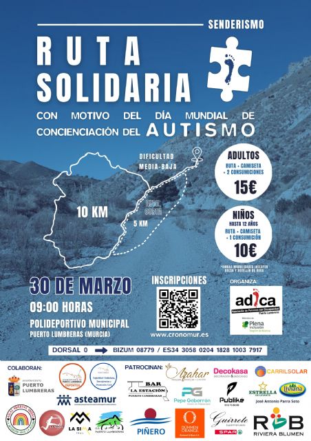 López ha explicado que "el día 2 de abril se conmemora el Día Mundial de Concienciación del Autismo y, con motivo de dicha efeméride, ADICA, la Asociación de Personas con Discapacidad en colaboración con el Ayuntamiento de Puerto Lumbreras, organiza la I Ruta Solidaria con motivo del Día Mundial de Concienciación del Autismo".