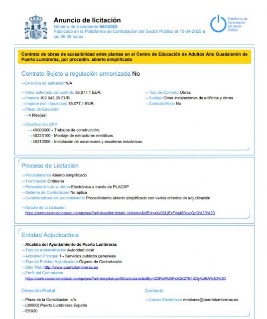 La alcaldesa de Puerto Lumbreras, María de los Ángeles Túnez, ha informado de la salida a licitación del contrato de obras de construcción de un ascensor en el antiguo Colegio Sagrado Corazón.
