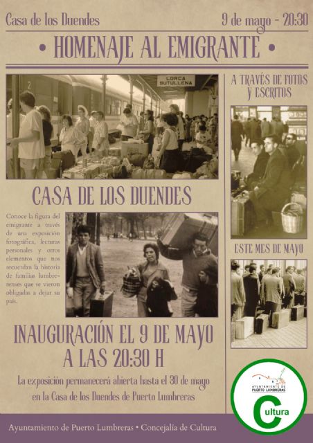 Navarro ha explicado que "este viernes, 9 de mayo, a las 20:30 horas, tendrá lugar la inauguración de la exposición 'Homenaje al Emigrante'. Una muestra que estará abierta hasta el 30 de mayo en la Casa de los Duendes".