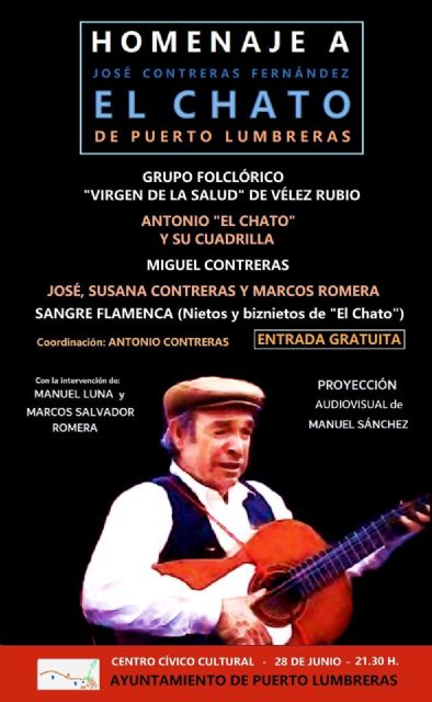La concejal de Cultura del Ayuntamiento de Puerto Lumbreras, Toñi Navarro, ha informado de la celebración del Homenaje a José Contreras Fernández ‘El Chato’. Navarro ha explicado que “el próximo sábado, 28 de junio, Puerto Lumbreras celebrará el Homenaje a José Contreras Fernández, ‘El Chato’. Este año, recuperamos el evento que tuvo que ser suspendido el verano pasado y con el que se reconocerá a una persona ilustre del pueblo”. “‘El Chato’ fue un lumbrerense muy querido.