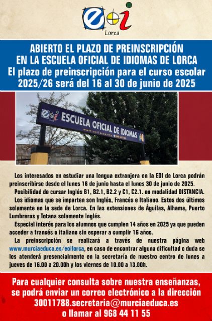 Hasta el próximo lunes, 30 de junio, se podrán materializar las preinscripciones a través de la web www.murciaeduca.es/eoilorca o en la secretaría del centro de Lorca para los niveles de inglés B1, B2.1, B2.2, C1 y C2.1