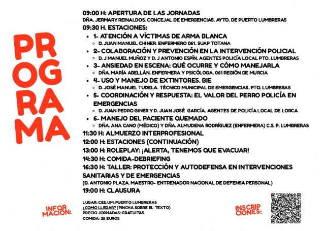 Por su parte, la teniente de alcalde y concejal de Seguridad Ciudadana y Emergencias, Jermary Reinaldos, ha detallado la programación que "comenzará a las 9:00 horas, con la inauguración de la jornada con la bienvenida a los participantes y continuará con las seis ponencias: 1. Atención a víctimas de arma blanca, a cargo de Juan Manuel Chiner, enfermero del 061 del SUAP de Totana; 2. Colaboración y prevención en la intervención policial, a cargo de José Manuel Muñoz y Juan Antonio Espín, agentes de Policía Local de Puerto Lumbreras; 3. Ansiedad en escena: qué ocurre y cómo se maneja, por María Abellán, enfermera y psicóloga del 061 en la Región de Murcia".